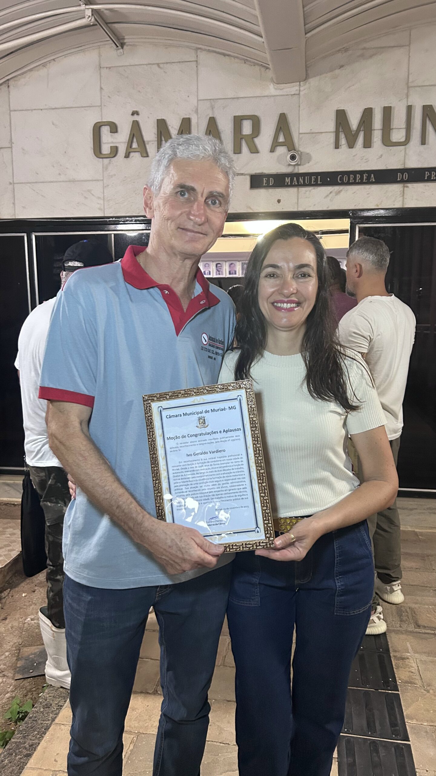 A Câmara Municipal de Muriaé concedeu, no último dia 3 de novembro, uma Moção de Congratulações e Aplausos ao senhor Ivo Geraldo Vardiero, em reconhecimento à sua destacada trajetória profissional e à relevante contribuição à formação de condutores na cidade.